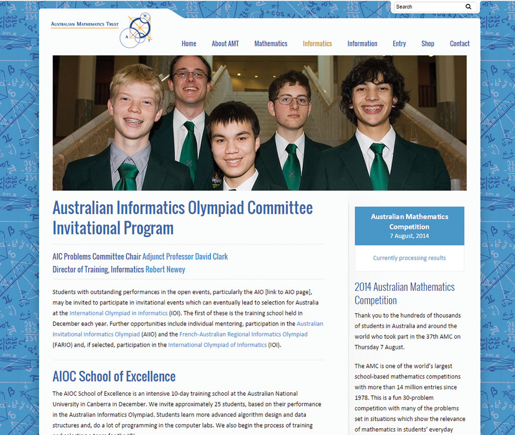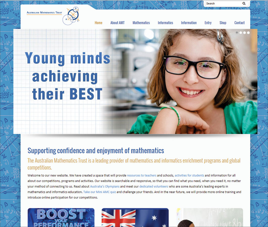 Australian Mathematics Trust requested a website revision. The existing AMT website needed upgrading and an overall redesign. The client also wanted the ability to make regular changes and updates to the web content – calling for the need of a CMS. Some of the features added to the new and improved site include: a dynamic events calendar, a portal from Teacher and Student resources, a blog for Matt Sums (AMT mascot) and an interactive mathematics quiz for students to practice on for the Australian Mathematics Competition (AMC).